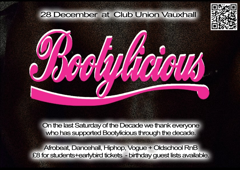 LGBTQ club night Bootylicious with Amapiano Dancehall RnB Hiphop classics and House and Garage, usually on the last Satuday of every month at Union
