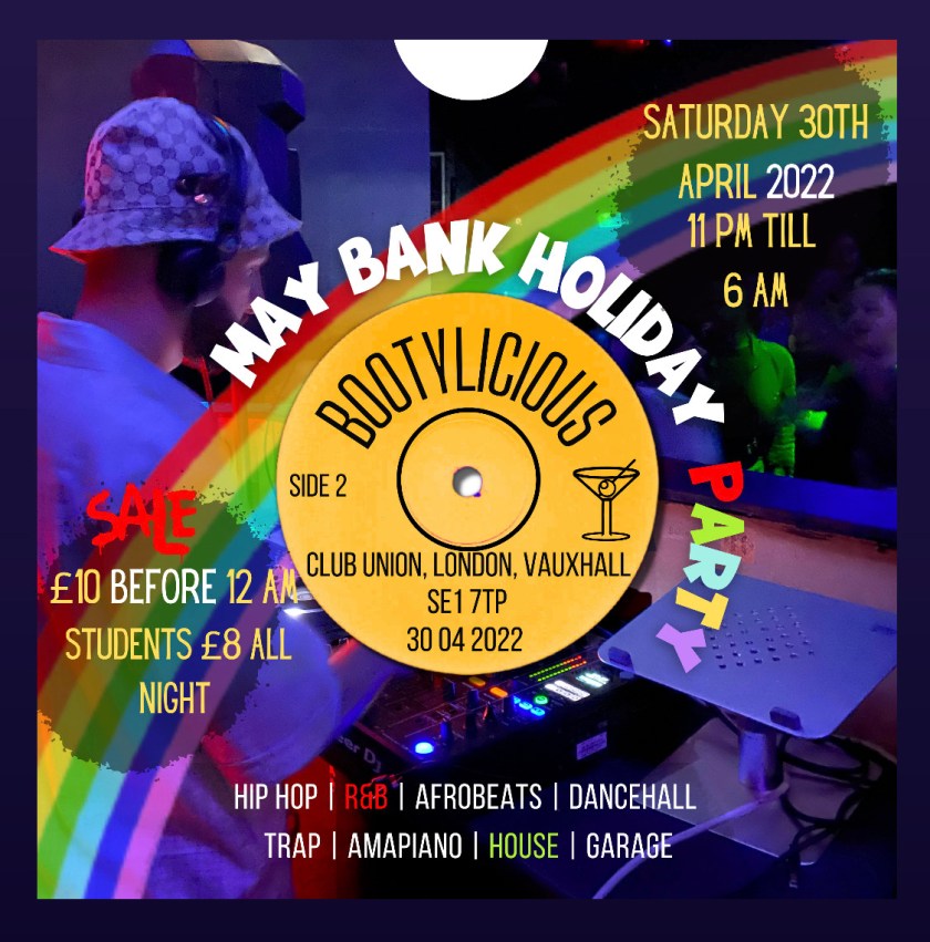 LGBTQ club night Bootylicious with Amapiano Dancehall RnB Hiphop classics and House and Garage, usually on the last Satuday of every month at Union